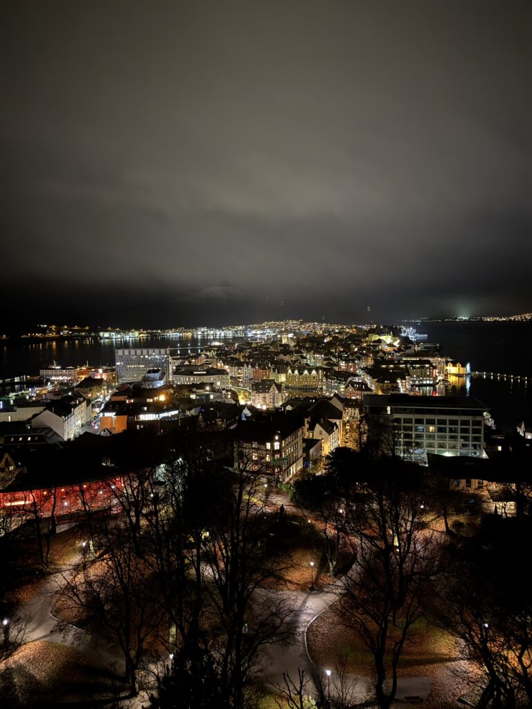 Później ruszyliśmy szlakiem Byfjelllet pieszym w kierunku stadionu Aksla: popularna trasa spacerowa. Po wędrówce zrobiliśmy zakupy w sklepie Kiwi, a następnie zameldowaliśmy się w naszym apartamencie Airbnb. Wieczorem odbyliśmy jeszcze jeden spacer po urokliwym centrum miasta, tym razem po zmroku, kiedy Ålesund prezentuje się wyjątkowo klimatycznie.